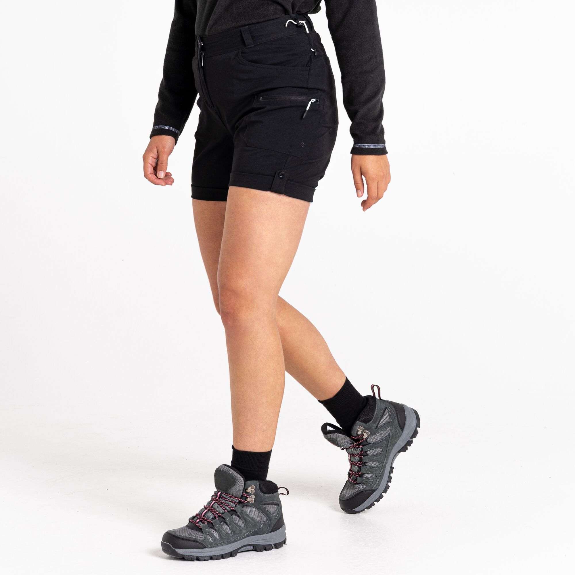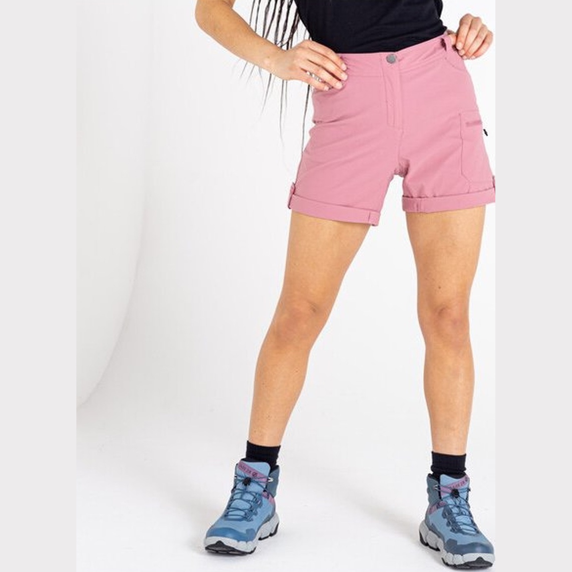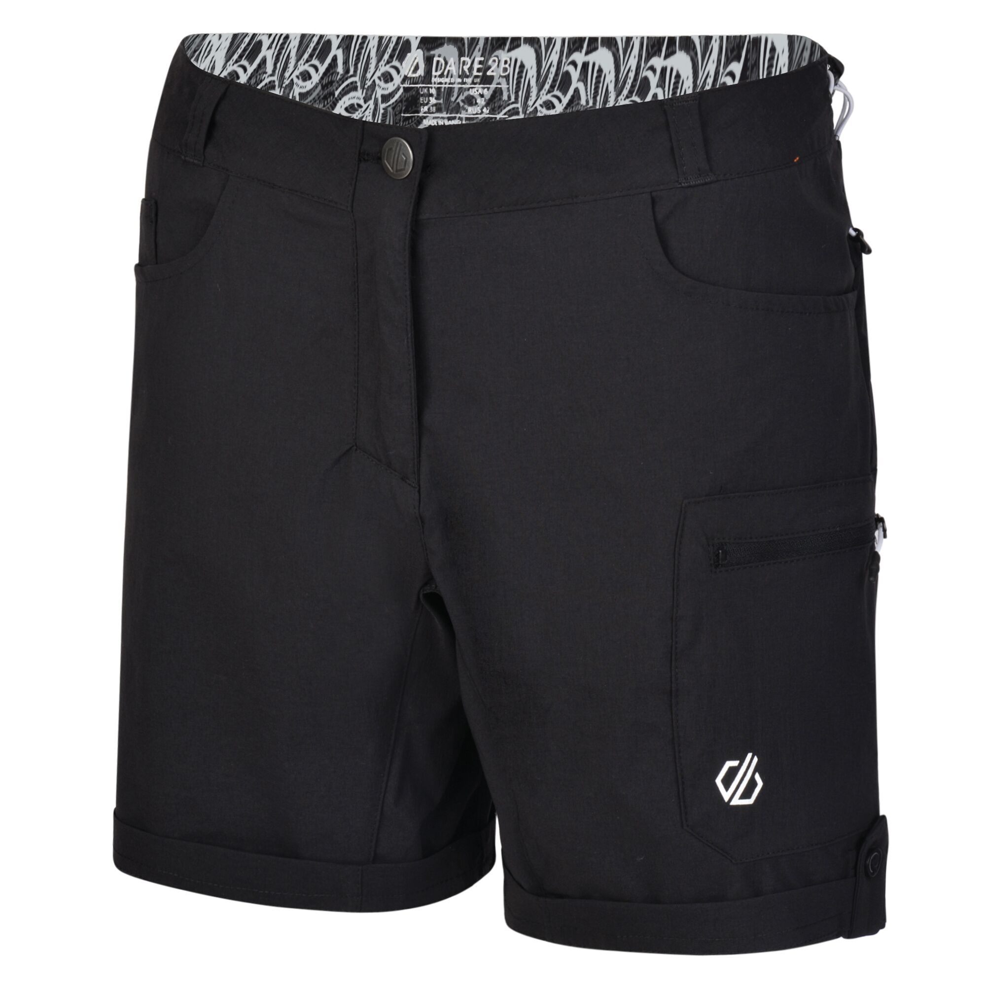 Dámské kraťasy s vodoodpudivou úpravou. Díky pružnému materiálu se v nich budete cítit komfortně při vycházkách, ale i při sportovních aktivitách. Na předním díle najdete dvě hlavní boční kapsy s jednou malou vnitřní a jednu stehenní, zapínatelnou na zip. Na zadním díle po dvou plochých a nenápadných kapsách.