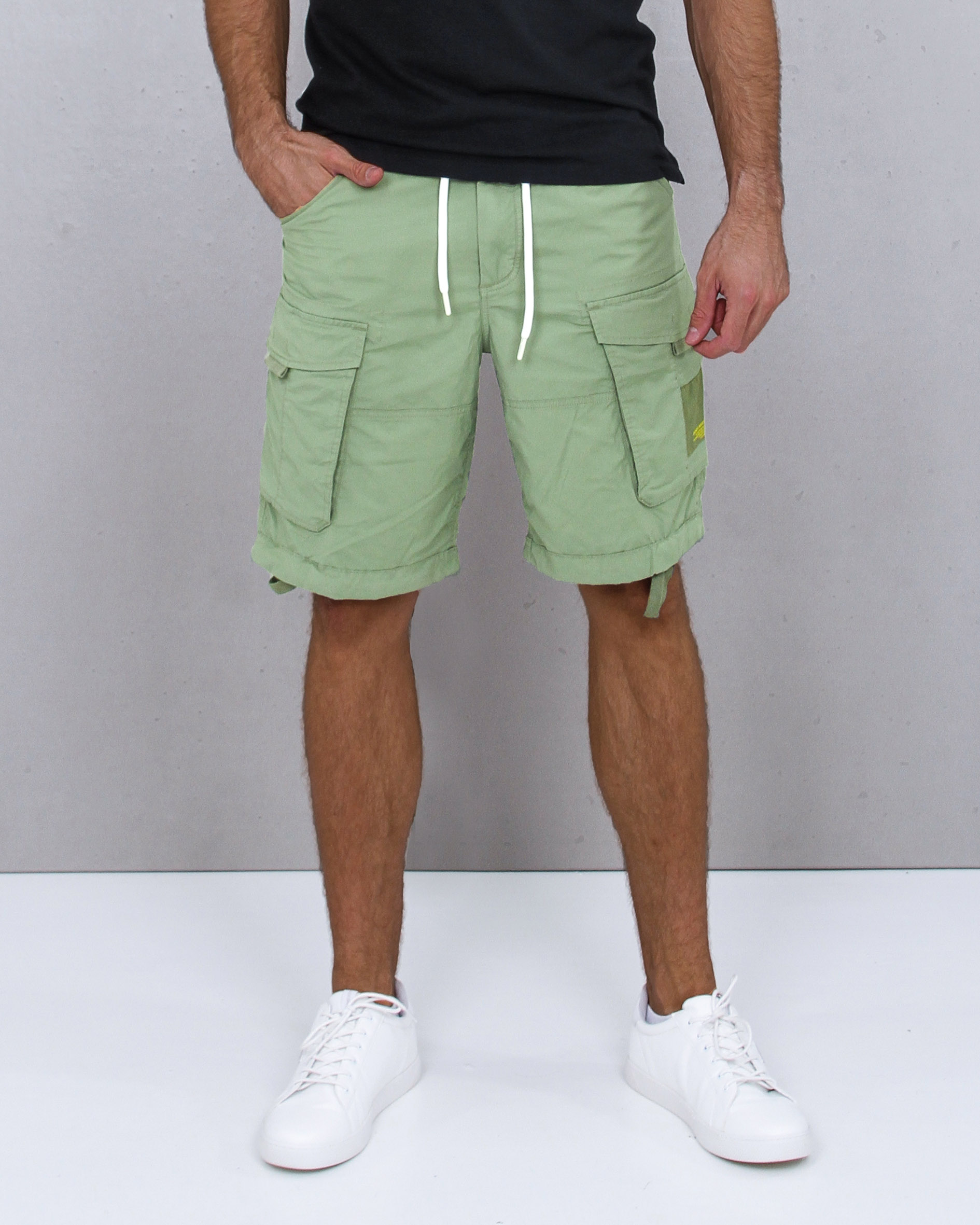 Kraťasy z velmi měkkého, lehkého a příjemného materiálu. Zapínání na zip, knoflík a pro úpravu pasu mají tkaničky.